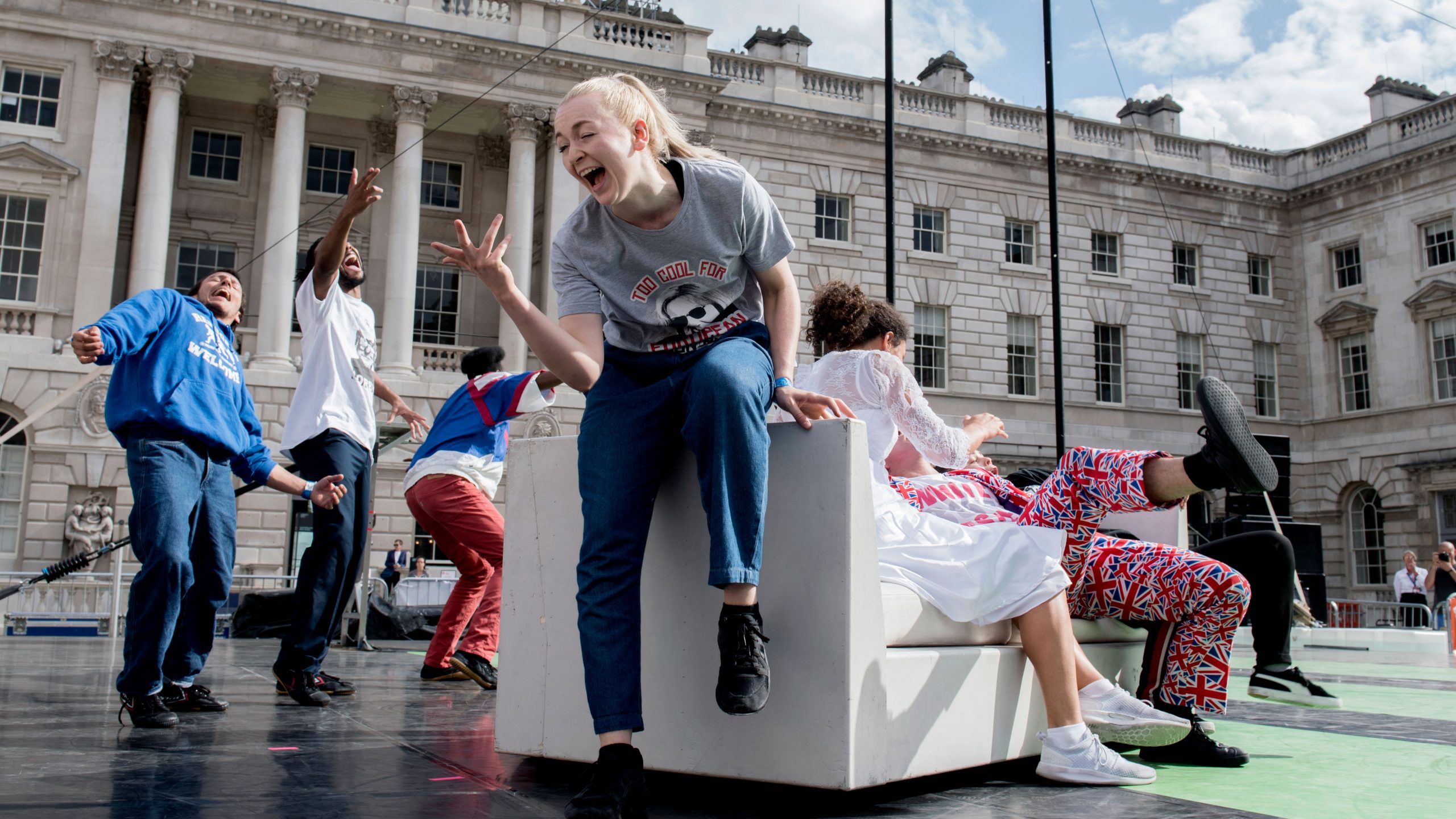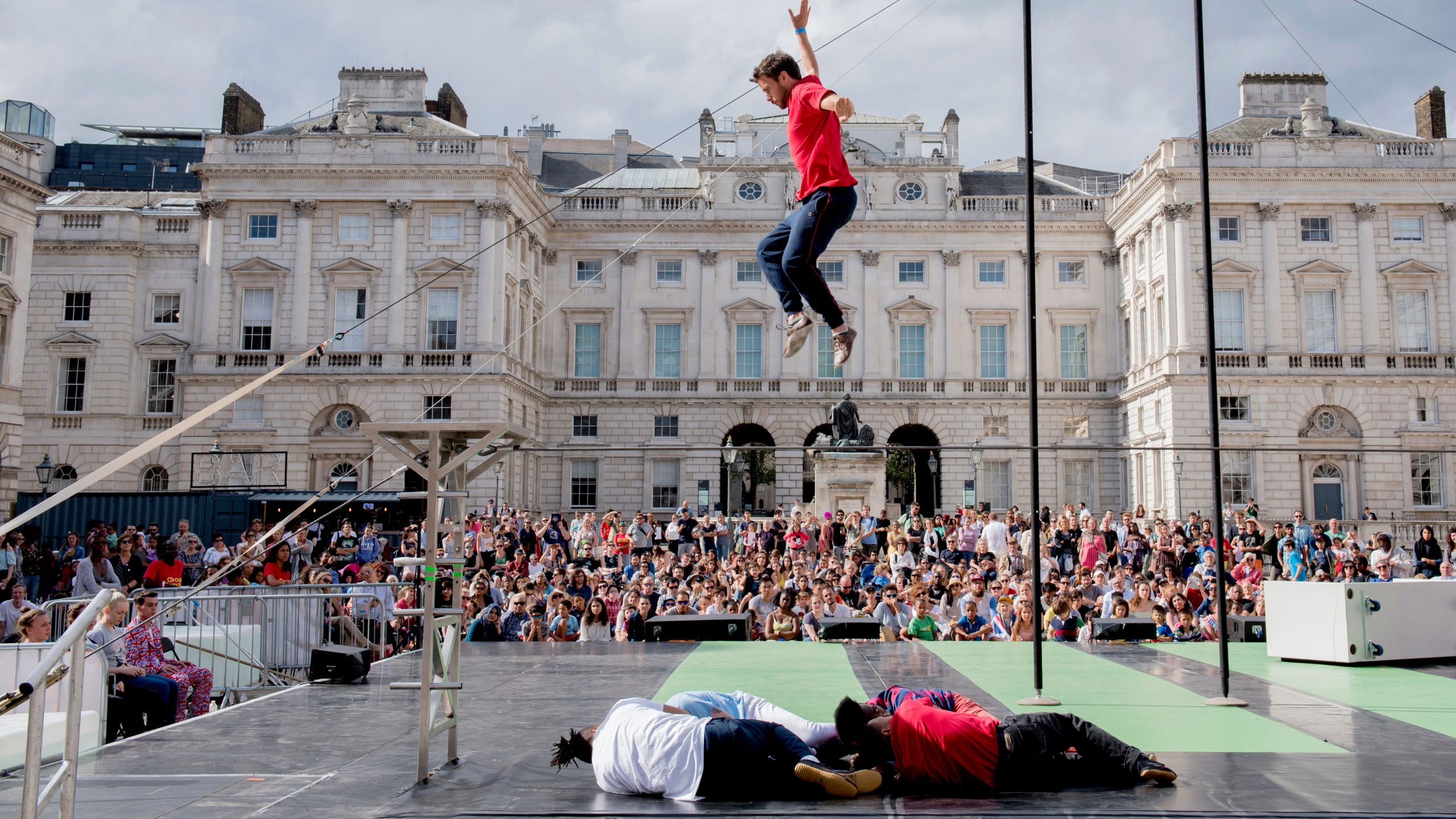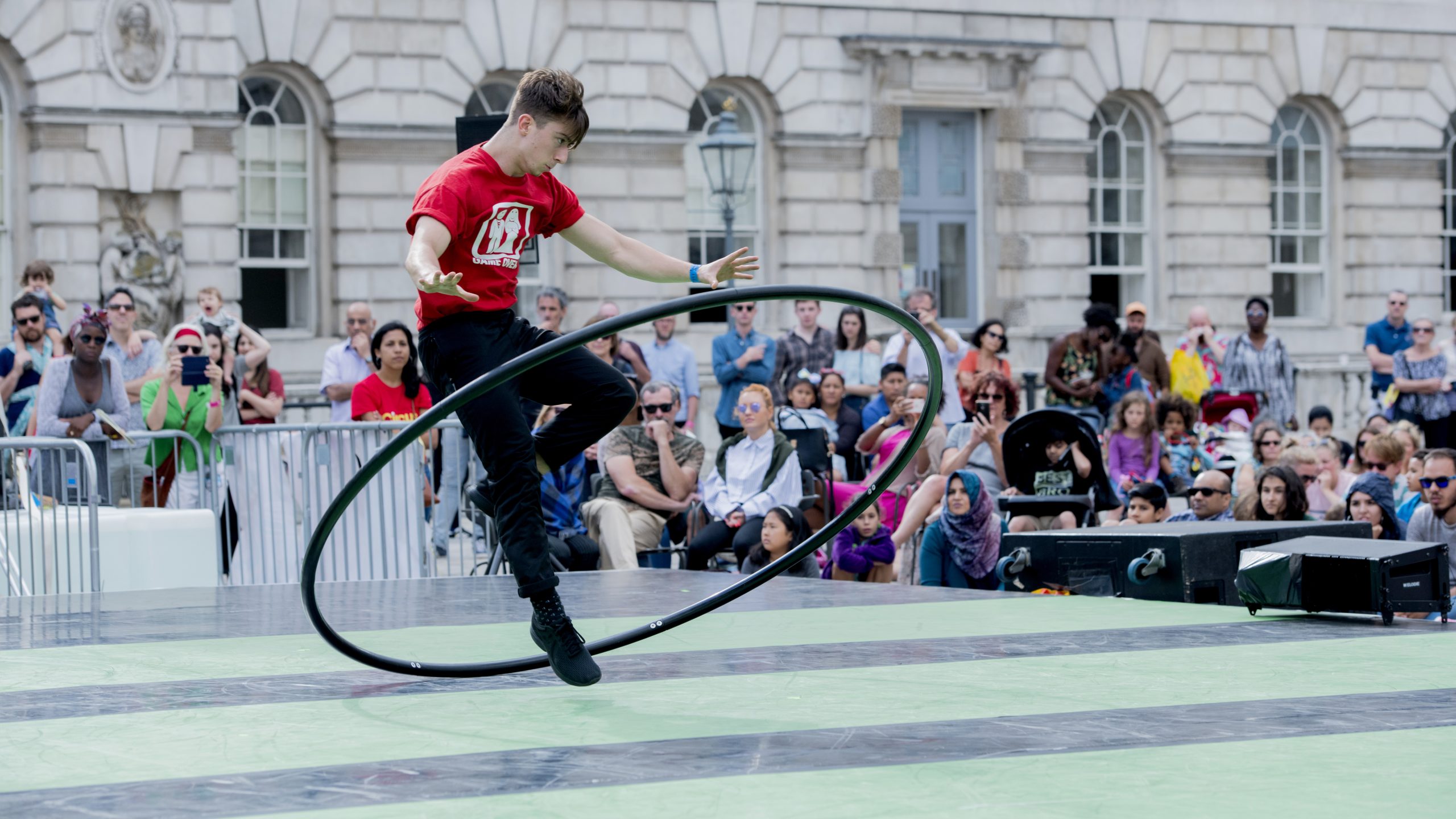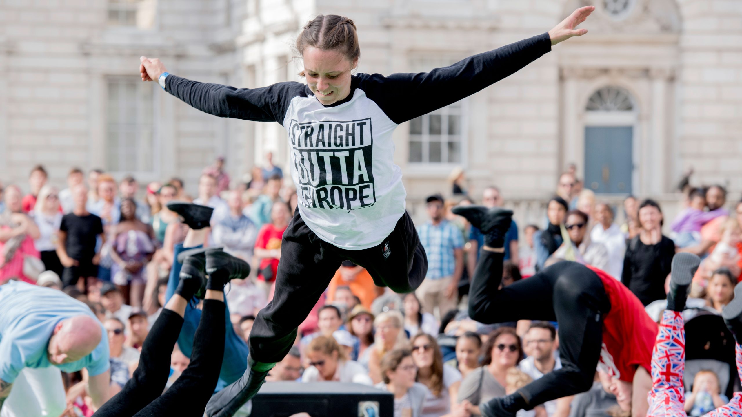 A bold fusion of hip hop dance and circus combining fast-paced footwork with Chinese Pole and tight-wire.