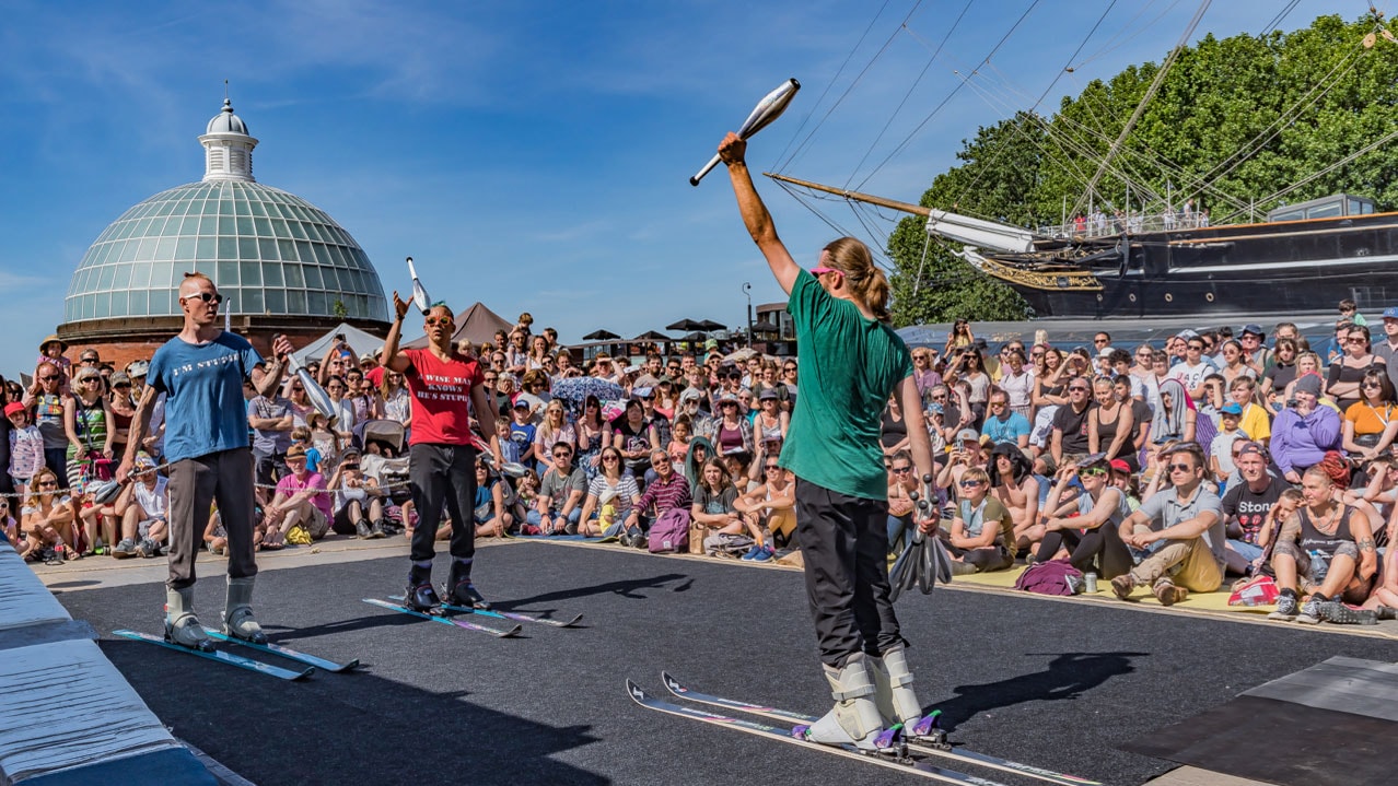 Three daredevil acrobats appear and disappear from the van to perform increasingly absurd and reckless tricks. With great skill and humour they fly off a huge seesaw, tumble with giant bouncing balls, juggle on skis, pogo, throw weights and push themselves to their physical limits.